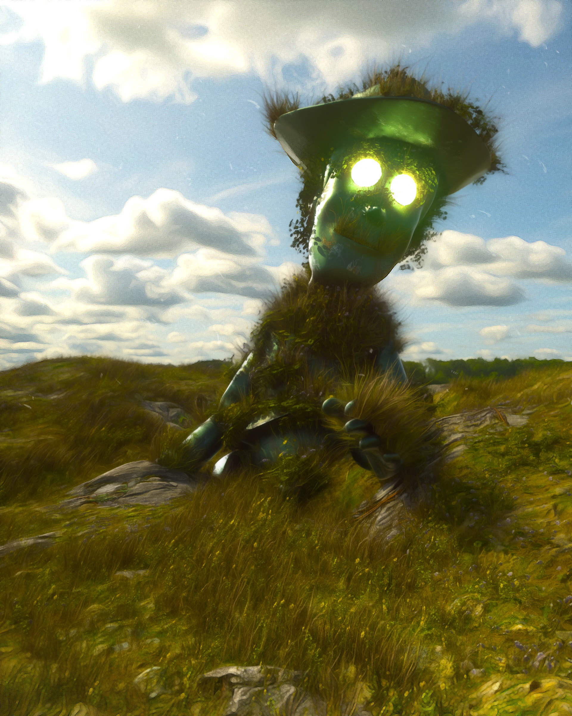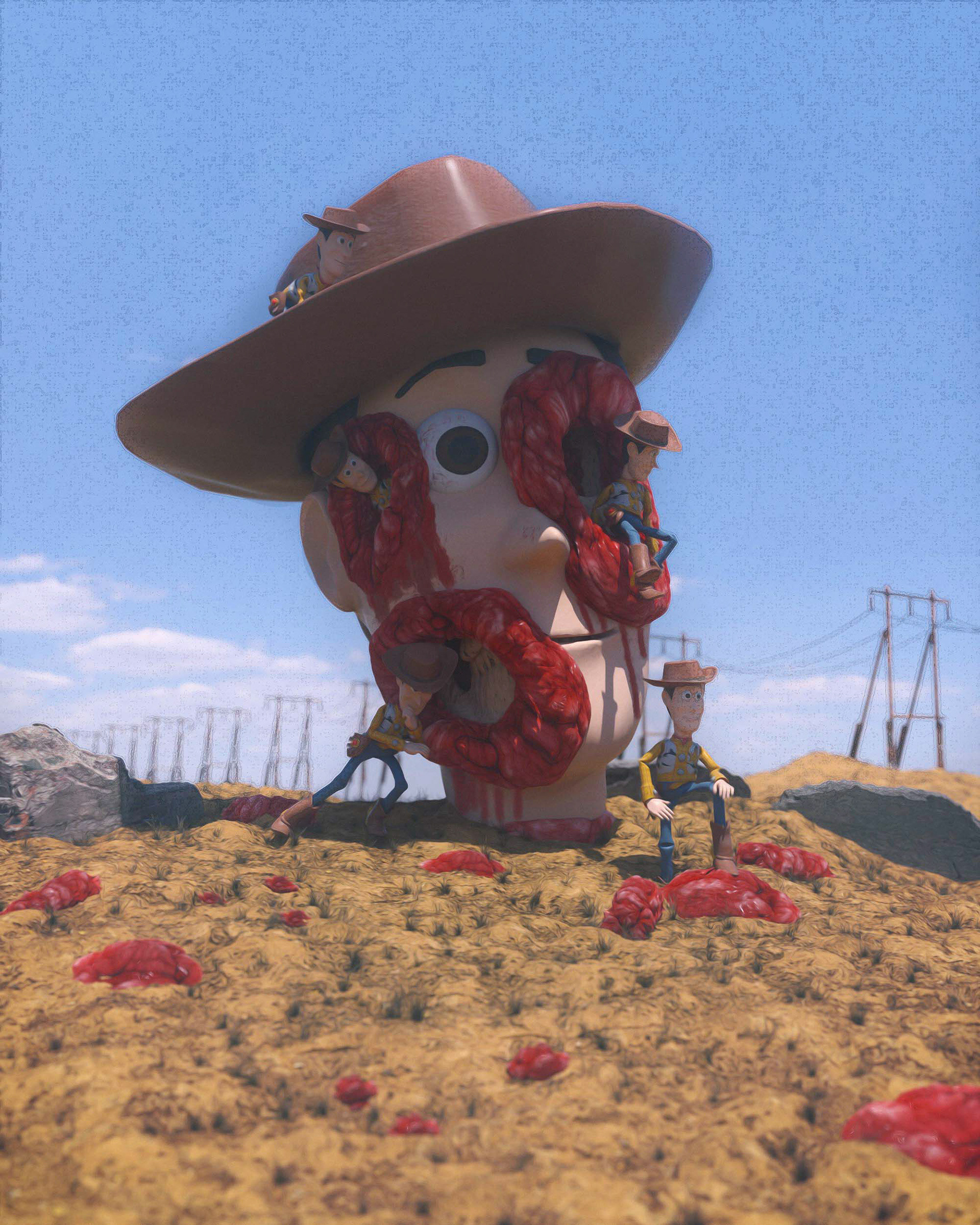 The assignment for these artworks were to mimic an artist, I chose Beeple because I love his quirky style and the shock factor he brings with most of his artworks. I used my own Woody model for this assignment.